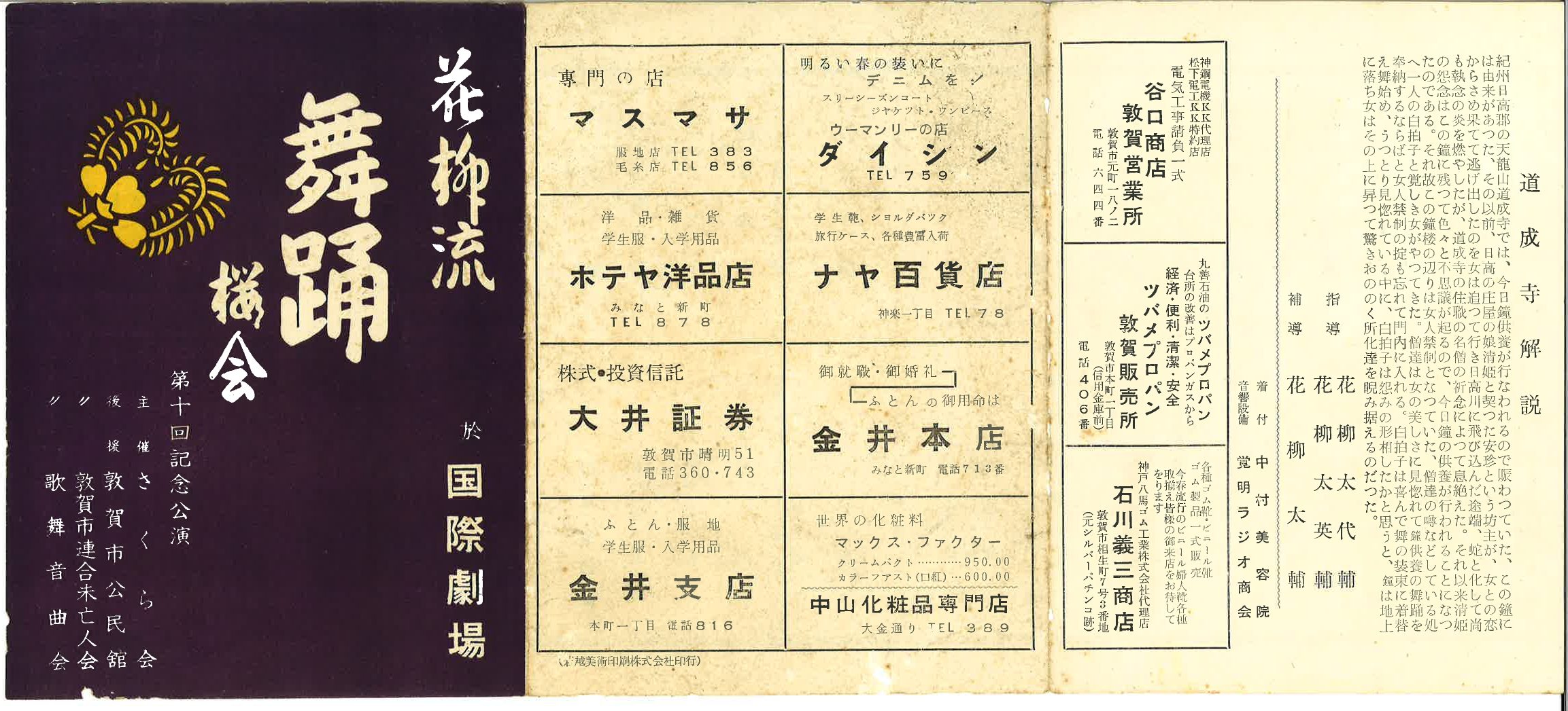 昭和32年(1957年)に敦賀市の国際劇場(当時の映画館)にて開催されました、花柳太英輔の名取襲名披露のパンフレットです。第10回記念公演と記載されています。